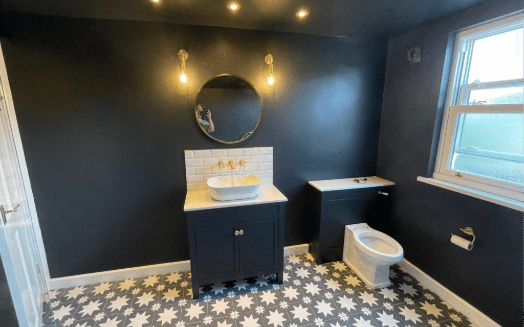 This striking Kensington bathroom features rich emerald green zellige tiles creating dramatic texture throughout the wet areas. The compact layout includes a walk-in shower with black-framed glass panels, white rectangular basin with brushed brass tap, and circular black mirror. Industrial pendant lighting, speckled terrazzo flooring, and black fixtures complete this sophisticated boutique hotel aesthetic on Kensington Road.